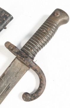 Two 19th Century French 1866 pattern ' Chassepot ' rifle sword bayonet with ribbed brass hilts, muzzle ring, forward facing quillon and recurved ' Yataghan ' style blade. Blade spines dated 1868 and 1874. Each measuring approx 70cm.