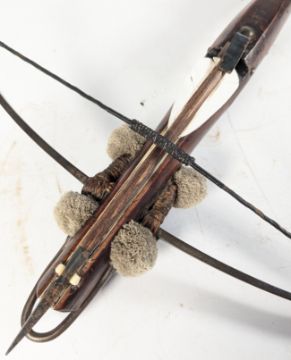 An 18th Century German sporting crossbow having a slender steel bow secures with twisted cords and pom pom decoration, hardwood tiller with with carved bone channel and cheek-piece inlaid with a star motifs. Measures approx 68x47cm.