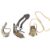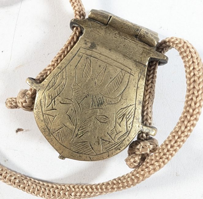 A collection of x3 early 19th Century Middle Eastern / Ottoman Empire musket powder flasks to include; brass hinged lid example on a plaited carry rope, silver horn shape with floral etching and stopper and a one on a leather attachment with lever mechanism. Larger measures approx 12cm.