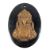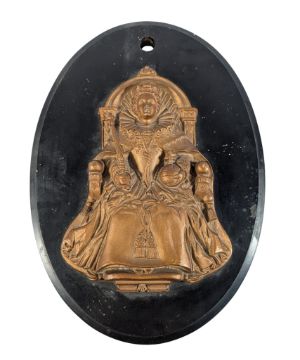 A cast tampion badge from HMS Queen Elizabeth, cast as Elizabeth I seated on a throne with orb and sceptre. Mounted on a black oval wooden board. Measures approx 44x30cm.
