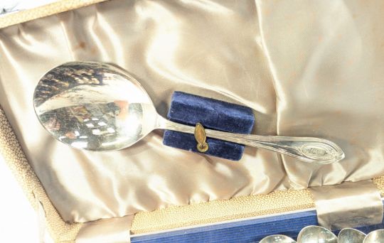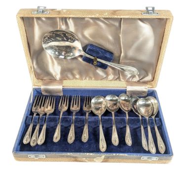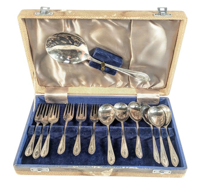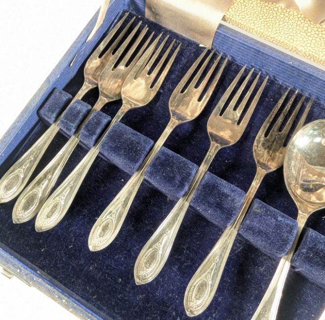 A WWII Second World War British Union of Fascists / Oswald Mosley's Blackshirts cased cutlery set. Each fork and spoon etched with a bundle of fasces. Housed in a velvet lined case.