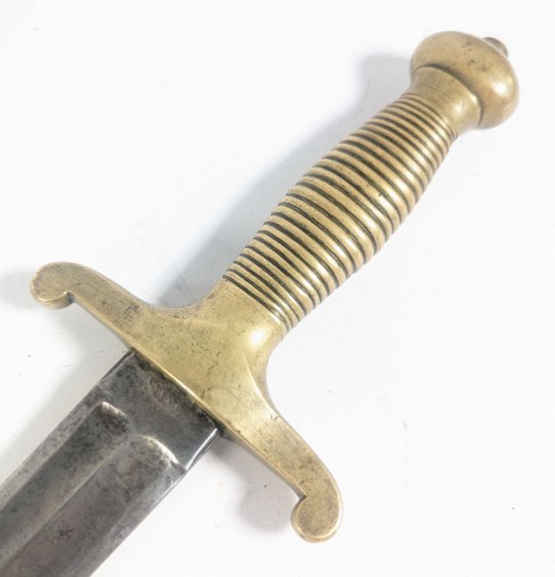 A 19th Century Continental French / Swiss Pioneer side arm having a round pommel, ribbed brass grip and crossguard with rolled down quillons. The blade ricasso stamped with manufacturer mark and leaf motif. Double fullered blade housed in leather sheath with brass mounts. Measures approx 70cm.