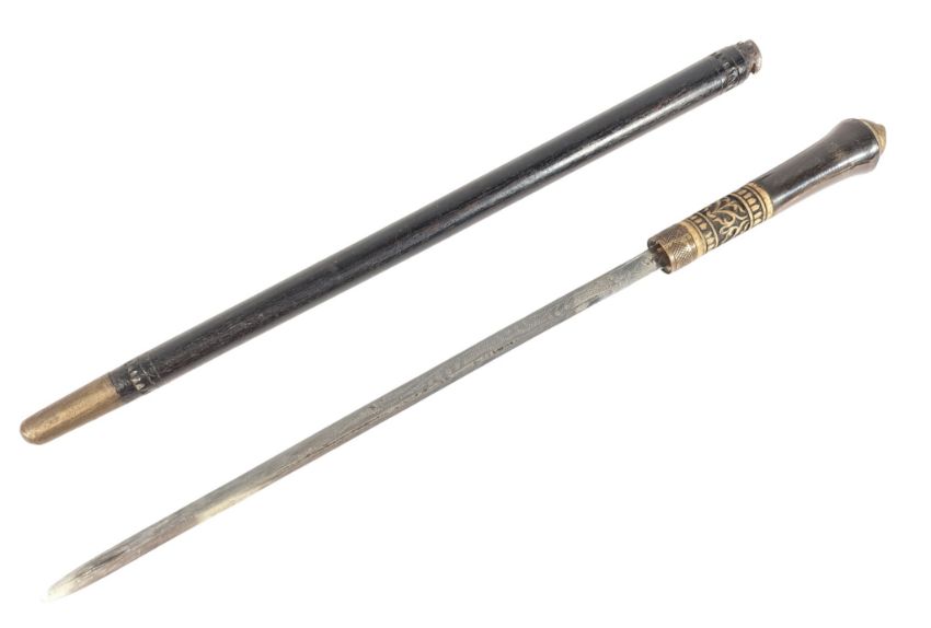 A late short 19th Century Indian gentleman's sword stick / walking cane with concealed blade. The cane having a brass pommel in the form of a tigers head, carved bone collar and a stiletto blade etched with ' India ' to the ricasso. Housed in a black wooden handle. Measures approx 58cm.