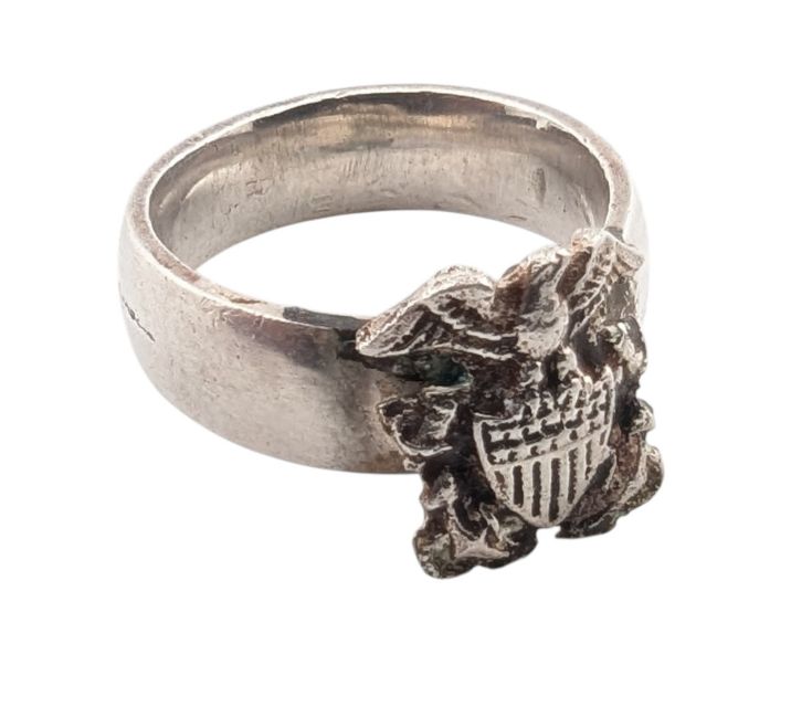 A WWII Second World War US United States Navy females silver ring. The ring band having a soldered US United States Army insignia. UK size M, US 6.5.