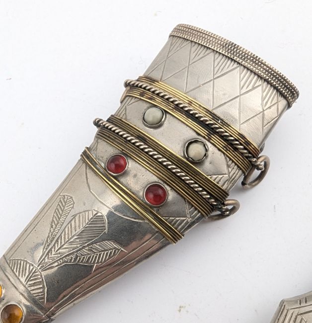 A Middle Eastern Palestinian / Jordanian / Bedouin Tribes Shibriya. The dagger having a waisted pressed metal hilt, blade etched with Thuluth script and a matching sheath decorated with twist wire bands polished glass stones. Measures approx 25cm.