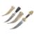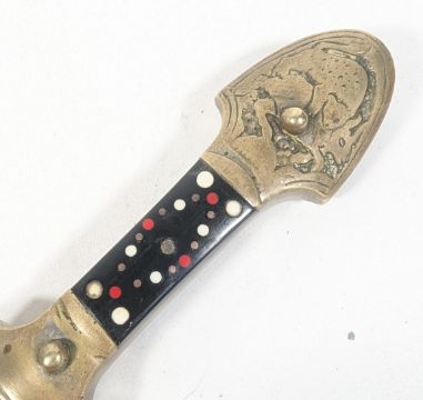 Two vintage Palestinian Jambiya / Khanjar daggers each having black synthetic grips inlaid with coloured spots and curved blades stamped with x3 stars. Housed in carved pressed metal scabbards. Larger measures approx 30cm.