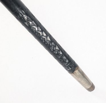 A 19th century Victorian gentleman's sword stick / walking cane with concealed blade. The stick with coloured enamel inlay in the pommel, carved bone grip and an etched silver collar. The blade etched with ' India ' housed in a lacquered wooden shaft with metal tip. Measures approx 90cm.