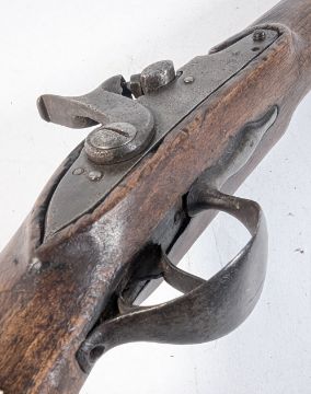A 19th century percussion cap muzzle-loading rifle with screw-off half octagonal barrel, and twist-off wooden butt. Mechanism works as expected. Measures approx 111cm.