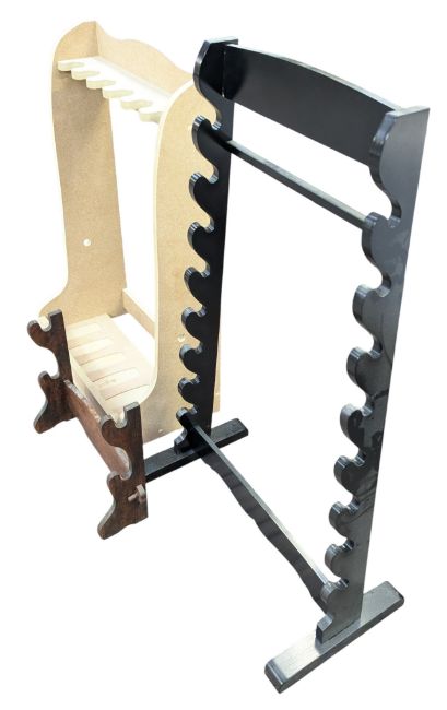 Three wooden rifle and sword display units. Rifle display having space for x6 rifles displayed vertically, the smaller ideal for dueling pistols and the other having space for x8 horizontally displayed swords.