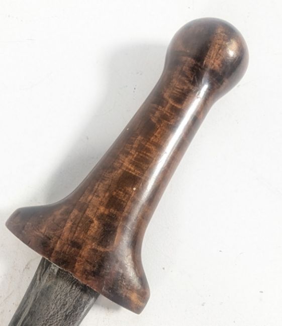 Two vintage ethnic daggers comprising a Japanese Tanto with carved bone effect hilt depicting traditional warriors / courtiers and floral motifs together with a South East Asian / Javanese Kris with a Damascus steel wavy blade. Larger measures approx 52cm.