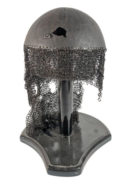 A 19th Century Islamic Indo-Persian / Mughal Empire Kulah-Khud Helmet. The bowl shaped dome skull having having an Aventail of chain mail attached to the perimeter. Skull having a battle damage crack where the spiked socket would be.