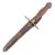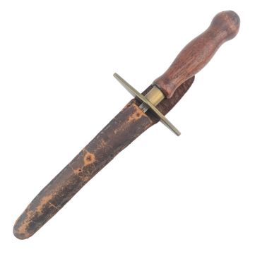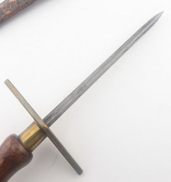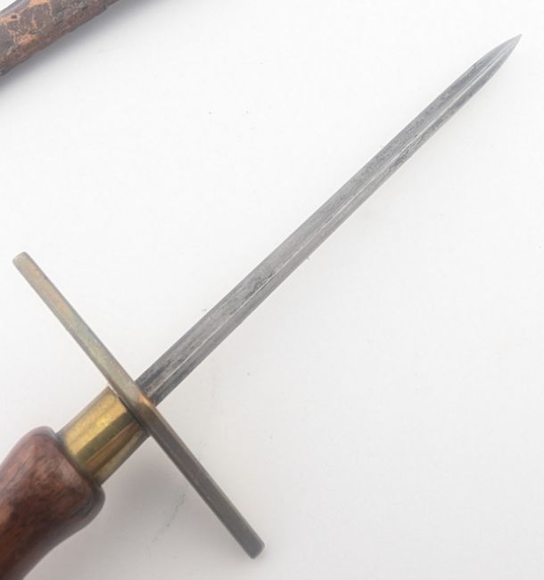 A 19th Century stiletto dagger with a polished wooden grip, rhombus shaped brass crossguard and a spiked triangular section blade. Housed in a brown leather sheath. Measures approx 23cm.
