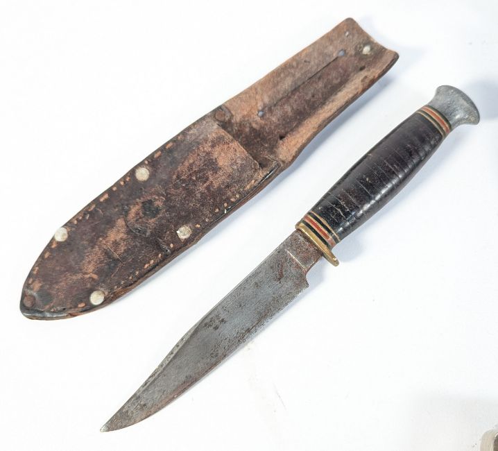 A collection of assorted militaria & curios to include; William Rogers Sheffield made boot knife, Saynor horn hilted folding penknife, Swiss Lion William Tell souvenir twin blade penknife, Spanish Civil War brass belt buckle, hip flask, x3 draw telescope, x3 mother of pearl and bone pocket knives, snuff box and a copper water flask.