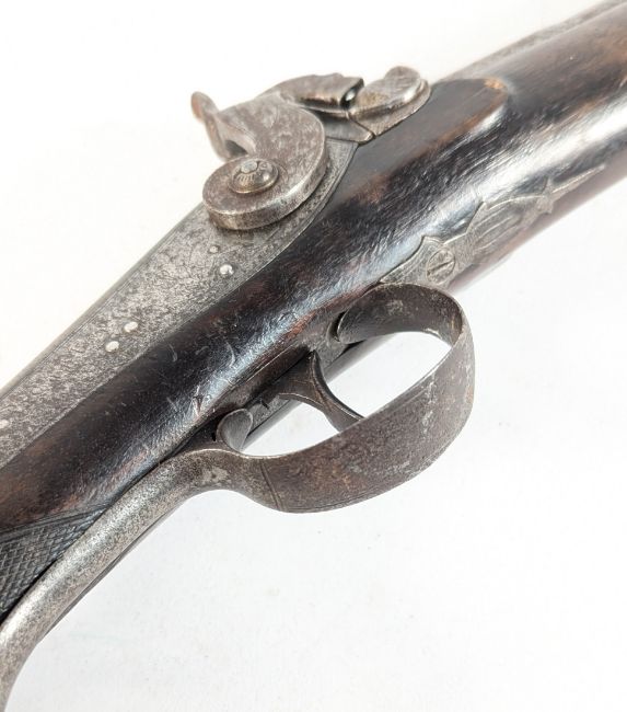 A 19th Century home made Blunderbuss with a chequered semi pistol grip foliate engraved lockplate and trigger and fluted barrel with brass muzzle. Mechanism cocks, half cocks and dry fires. Measures approx 74cm.