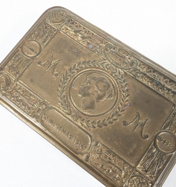 Two WWI First World War Princess Mary 1914 Christmas tins. Both without contents, one lined with wood.