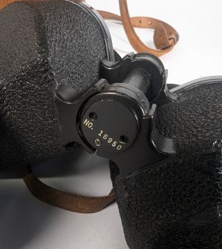 A WWII Second World War US United States Navy Westinghouse M15 anti-submarine binoculars. The binoculars having 7x50 magnification and variable darkness lenses that are clear. Housed in a brown leather case dated 1944 on the lid.