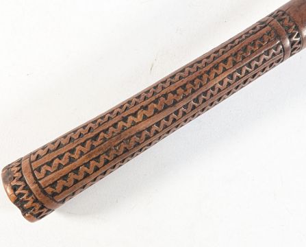 A Polynesian / Fijian hardwood throwing club / I Ula Tavatava carved from a single piece of root wood with a lobed top and chiselled shaft. Measures approx 44cm.