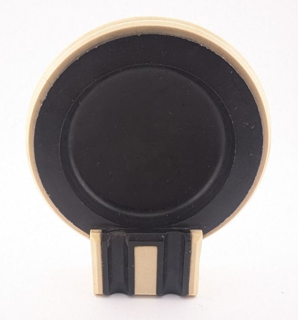 A vintage Cunard Line RMS Queen Mary art deco style onboard Bakelite ashtray as used in First Class lounges and cabins. Two cigarette grooves and the ship's name inlaid in black. Measures approx 12x10cm.