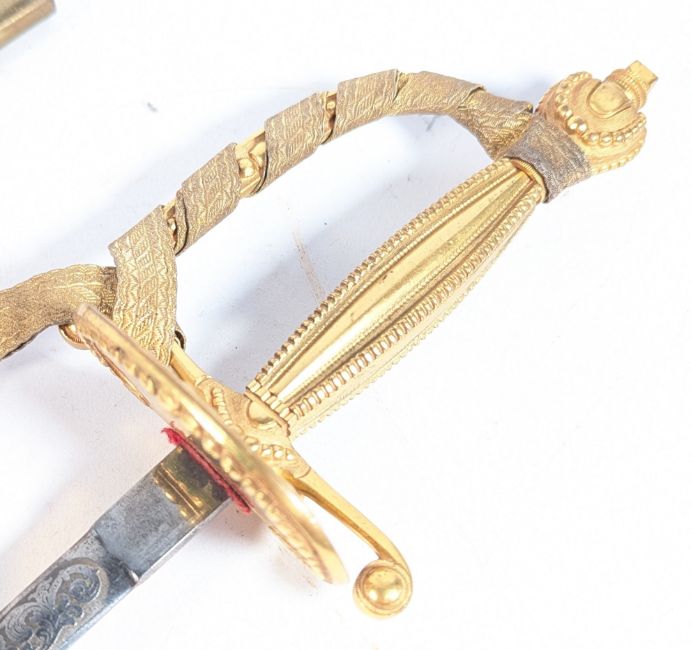 A 19th Century Victorian English Court sword having an urn shaped pommel, ribbed and beaded grip, sword knot and shell guard. Ricasso etched 'Cutler & Rooke 24 St James Street London' and tapering blade etched with floral scrolls. Housed in lather scabbard with brass mounts. Measures approx 98cm.