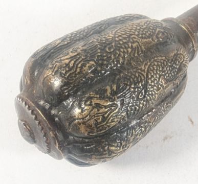 A 19th Century Chinese bronze battle mace in a 17th century style. The mace having a faceted bronze pommel, wooden grip and a carved mystical creature with open mouth at the base of the shaft. The head etched with serpents and dragons. Measures approx 52cm.