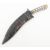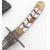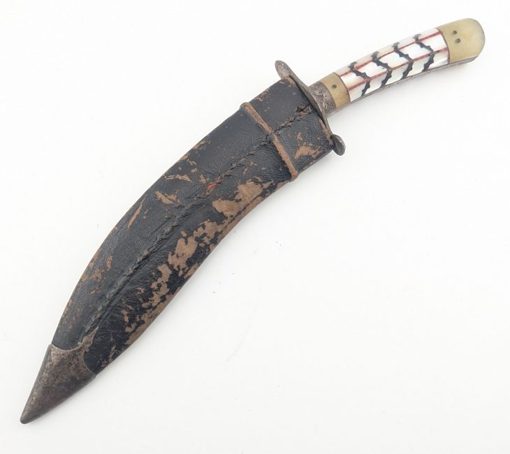 A mid 20th Century Nepalese / Indian child's Kukri knife dagger having an ornamental mother of pearl and jade section grip, swept crossguard and a sharp curved blade. Housed in a leather lined sheath. Measures approx 25cm.