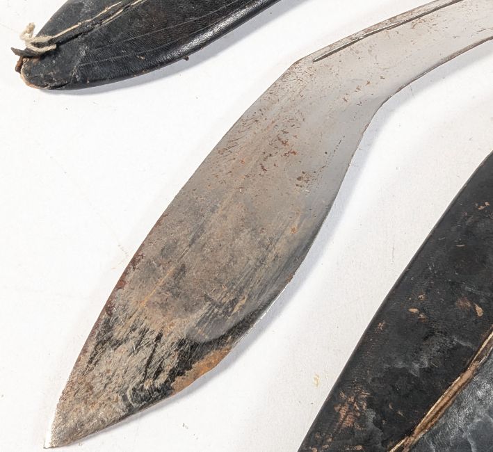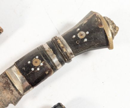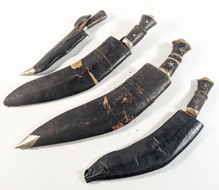 A collection of x4 vintage Indian / Nepalese Gurkha Kukri knife daggers. Typical form with Lion head pommels, caved horn grips with metal inlay and hooked blades. One having a 'wavy' blade. Largest measures approx 44cm.