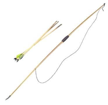 Archery - an original Bickerstaffe made medieval style long bow with buffalo horn nocks at each and leather grip together with x brass tipped arrows. Bow measures approx 195cm.