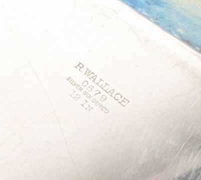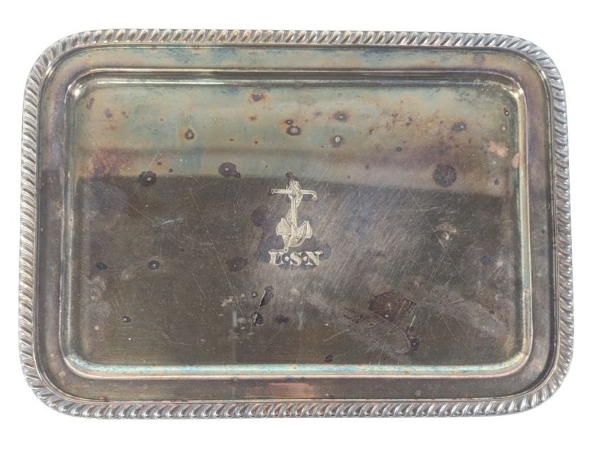 A United States Navy silver plated officers mess hall serving tray etched with U.S.N and fowled anchor to the middle. Stamped on verso R. Wallace 0679 silver soldered. Measures approx 30x21cm.