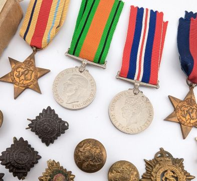 A WWII Second World War medal group and assorted badges and buttons. Medals comprising British War medal, Defence medal, 1939-1945 Star and Africa Star together with box of issue.