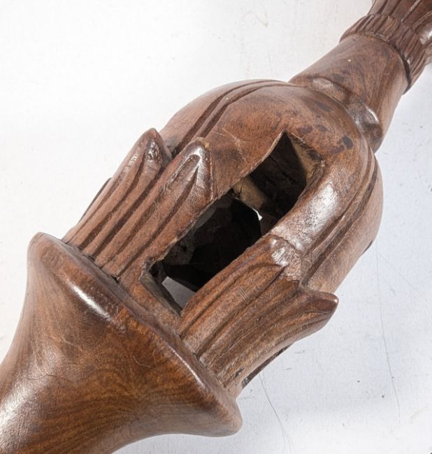 A hand carved African Tonga River People (Zambia / Zimbabwe) Nyami Nyami walking stick depicting a fish head with a coiled snake body, figures praying and a pierced cavity with a trapped wooden ball supported by an outstretched hand. Measures approx 102cm.