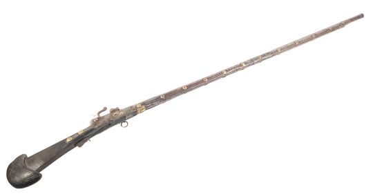 A 19th Century South Asian / Mughal Empire matchlock Toradar style musket rifle having a slender wooden stock with bulbous terminal, iron barrel and copper coin decoration. The trigger pulls and matchlock mechanism connects with the flash pan. Measures approx 145cm.