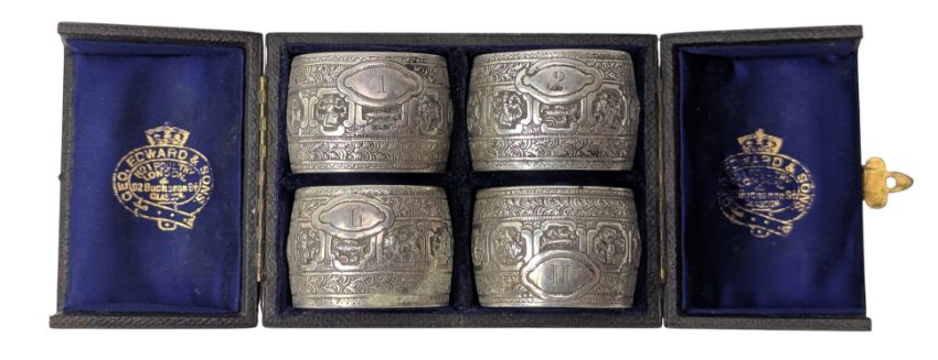 A cased set of four Victorian Scottish hallmarked silver napkin rings. Hallmarked year 1877, Glasgow. Sponsors mark for James Reid & Co. Completed in a 'Geo, Edward & Sons' presentation box. Total weight approx. 117g.