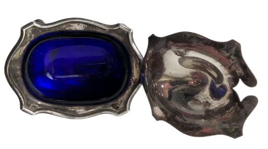 An Edward VII hallmarked silver vesta case. Hallmarked year 1904, Birmingham. Sponsors mark for H H & S. A George V hallmarked silver & blue glass lined mustard pot. Hallmarked year 1936, Birmingham. Sponsors mark for William Suckling Ltd. Together with a pair of silver filigree egg cups with floral decoration. Unmarked. Tests indicate silver. Total weight approx. 170.g. (Excluding blue glass liner)