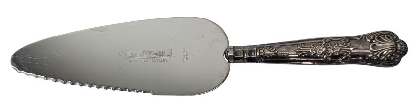 A cased George V hallmarked silver handled fruit knives. Hallmarked year 1933, Sheffield. Sponsors mark for James Dixon & Sons Ltd. Completed in a presentation box. Together with an Elizabeth II hallmarked silver handled cake knife. Hallmarked year 1965, Sheffield. Sponsors mark for Harrison Brothers. Completed in a printed presentation box. Total gross weight approx. 196g.