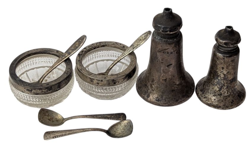 A pair of George V hallmarked silver salt shakers. Hallmarked year 1919, London. Sponsors mark for Richard Owen Williams. Together with two 800 silver & glass table salts. Further together with four 800 silver condiment spoons. Stamped 800. Total gross weight approx. 134g.