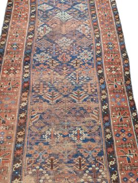 An early 20th century Persian Islamic Heriz carpet floor rug runner. Having a central blue / red field with geometric repeating medallions with two brown ground borders with a larger repeating pattern in between. 307cm x 122cm approx.