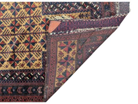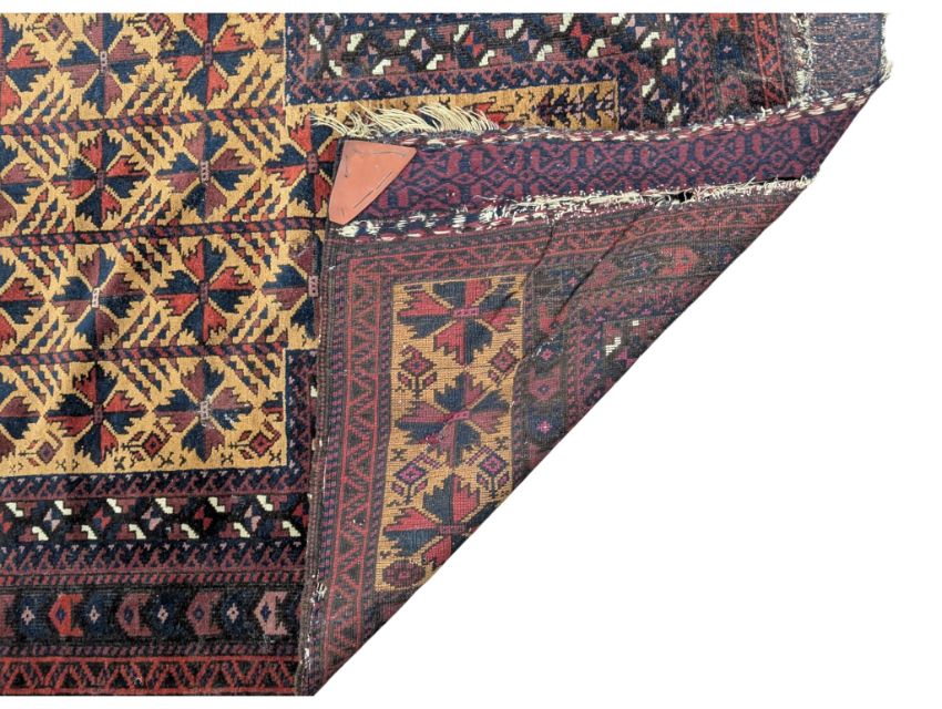 19th century Persian Islamic Baluchi / Timuri prayer rug. Yellow field with repeating pattern, to centre with direction with repeating inner and outer borders and smaller panels. Measures approx: 146x88cm