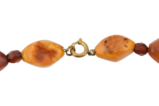 A continental amber and bead necklace. The necklace strung with faceted bead spacers on a chain cord to spring hoop clasp. Measures 58cm. Weight 51g.