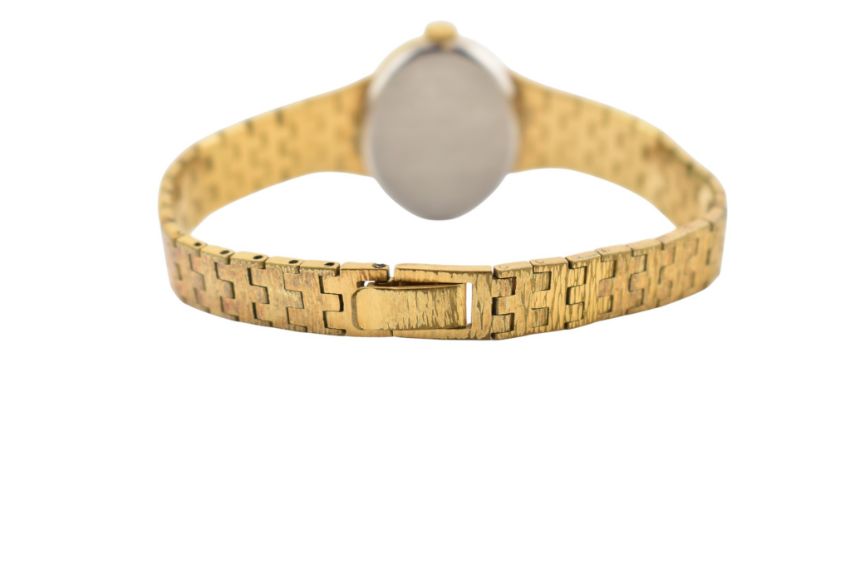 A 1970s Tissot ladies wristwatch. Gold plated oval champagne dial and case with baton markers. Set to a bark effect bracelet. Weight 28g approx. Ticking at time of cataloguing but not guaranteed to continue to do so.