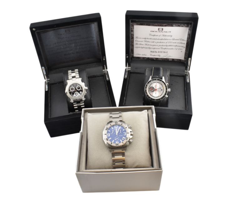 Collection of Oceanaut wristwatches. To include, model CG131103 with a stainless steel case and strap, baton markers and blue face with Oceanaut marked to the top centre and back of watch. Approx case diameter: 40mm. Model 5CK571204, with stainless case and black leather strap, Swiss chronograph movement and Sapphire crystal glass case. Approx case diameter: 40mm. Model BK 271L01 with a stainless steel strap and case, crystal detailing and black and stainless steel face. Approx case diameter: 40mm. All boxed.