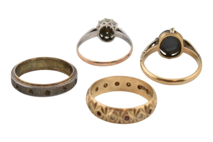 A collection of gold and silver rings. The rings to include an early 20th century 9ct opal doublet ring AF claws broken. A hallmarked 9ct eternity ring. A paste set ring marked 9ct Sil, a gem set eternity ring marked 9ct and Sil. Total weight 8.9g. Two gold rings 5.1g. Size L,M,N,O.