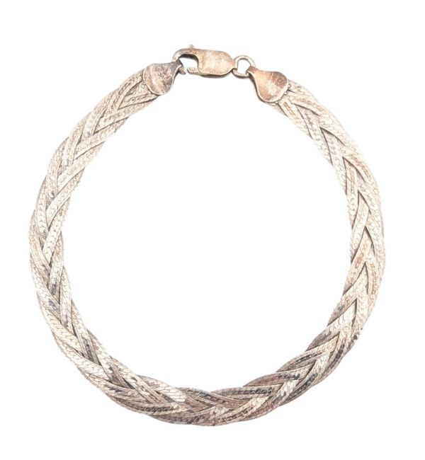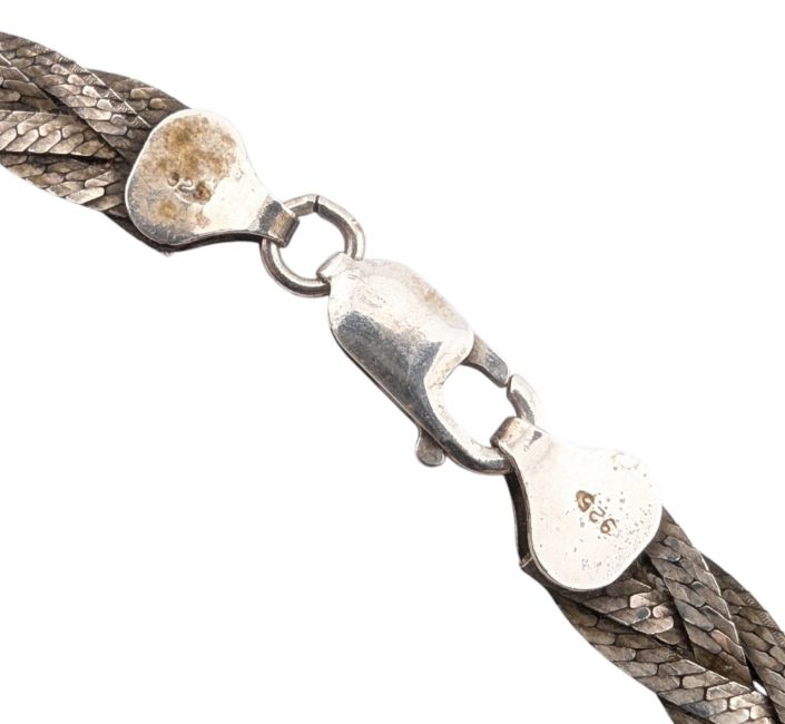 Hallmarked 925 sterling silver necklace and matching bracelet. The jewellery formed with braided chains to lobster clasps. Stamped: 925 Italy Weight: 24.2g. Measures 46.6cm and 21cm.