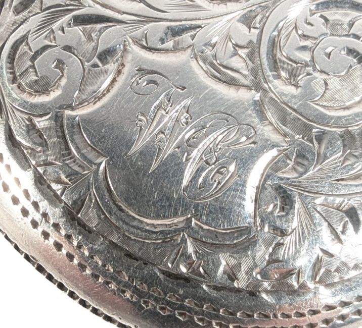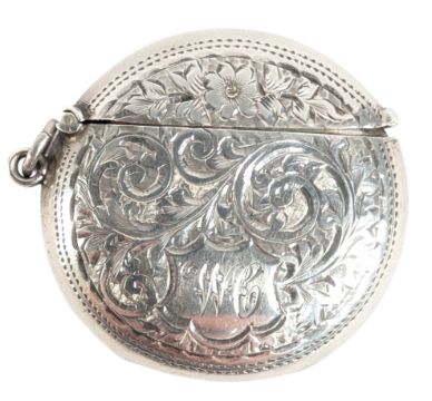 A hallmarked silver Edwardian vesta case of circular form. Hallmarked for Birmingham, 1902 with sponsor's marks S&A. Engraved with foliates and a monogram to the front. 22g.