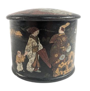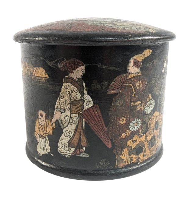 A 19th century Japanese papier mache pot, decorated with traditional Japanese scenes and motifs. Hand painted, with figures to the lid. 7cm tall.