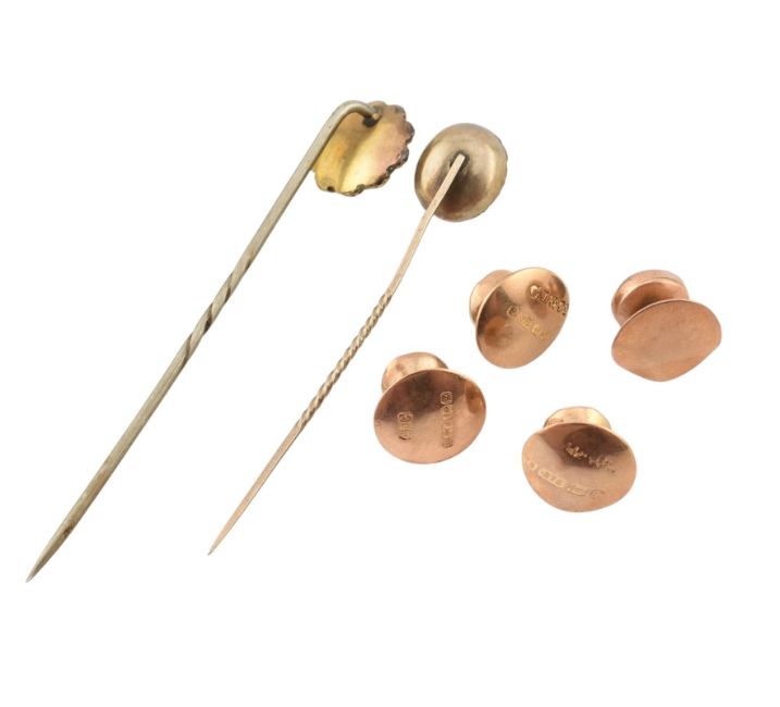 An assortment of gold antique gem set button studs and lapel pins. The studs to include a 9ct gold moonstone set stud and three 9ct gold paste set. The stick pins include a hair locket pin in a floral mount, pearl set pin. Total weight 5g.
