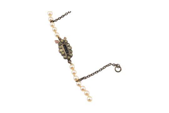 An early 20th century pearl necklace. The necklace is formed with knotted graduated pearls ranging from 6mm - 1.5mm having a paste set clasp marked 9ct. Measures 49cm