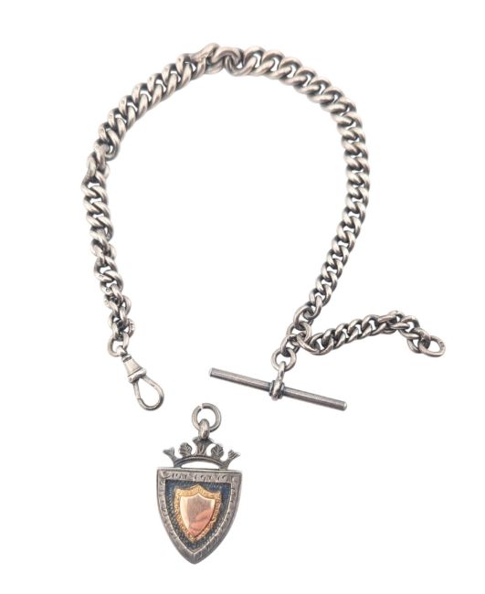 An early 20th-century hallmarked silver Albert watch chain and fob. The chain with graduating links marked with lion passant, the fob hallmarked Birmingham 1924. Lion passant marks to T-bar and the dog lead clasp. Total weight 70.4g