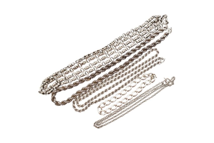 A collection of silver necklace chains and a bracelet. To include fancy link, rope twist etc. 118g. Chains measures 80cm, 54cm,38cm. Bracelet 16cm