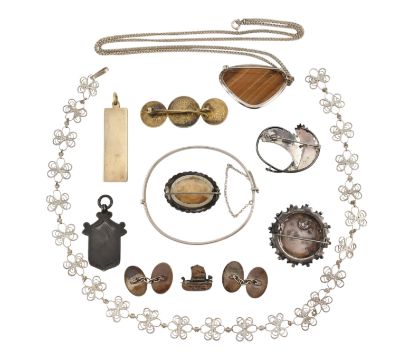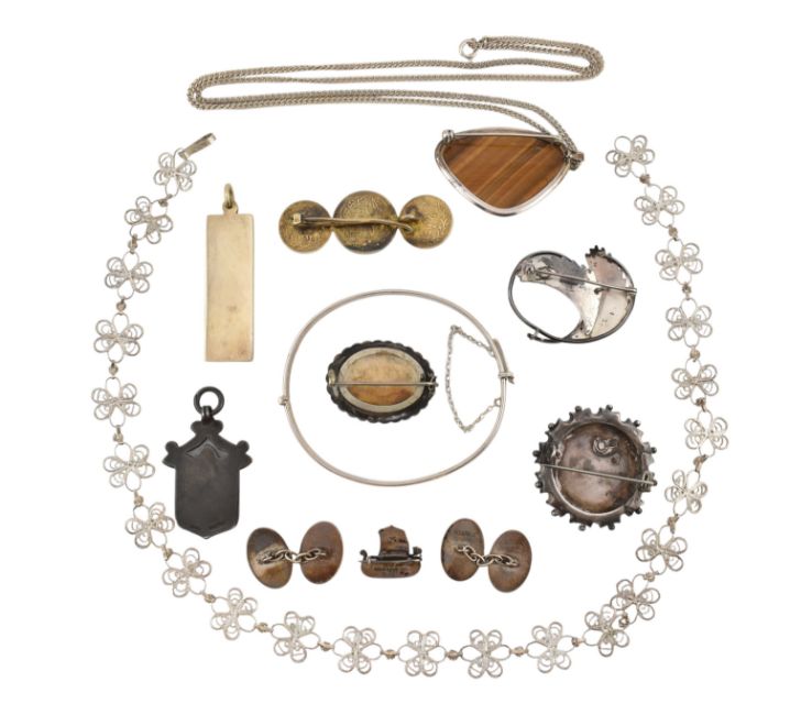 A collection of silver and white metal jewellery. The collection to include a Victorian brooch pin, coin brooch, filigree flower necklace, a fob medal, Victorian jubilee brooch pin, hallmarked silver bangle, silver cufflinks and a Norwegian silver viking boat brooch pin. Together with a contemporary tigers eye pendant brooch necklace and a silver hallmarked jubilee ingot pendant. Total weight 113g