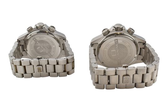 Oceanaut Baltica BJ1B1113 and BJ1B1106 stainless steel Chronograph analog quartz gentlemen's wristwatches. Both with two tone colourway stainless steel cases. One with an orange dial bezel and face and the other with red. Water resistant. Approx case diameter: 50mm. One with matching box. No apparent paperwork.
